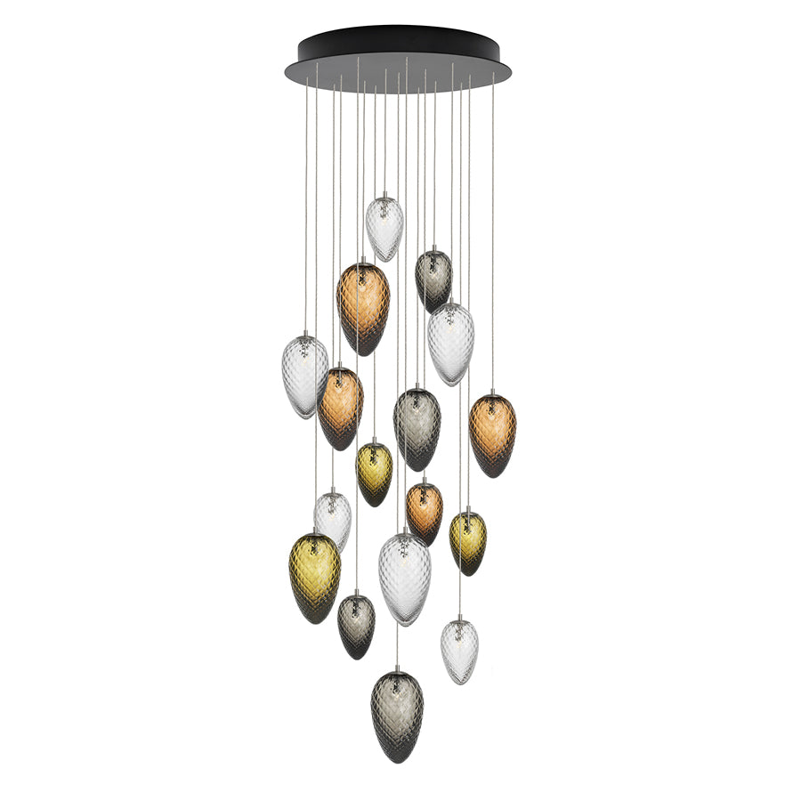 Inneholder 17 munnblåste kongler i en storslått samhandling av kongler i alle farger. Sambu består av størrelsene og fargene