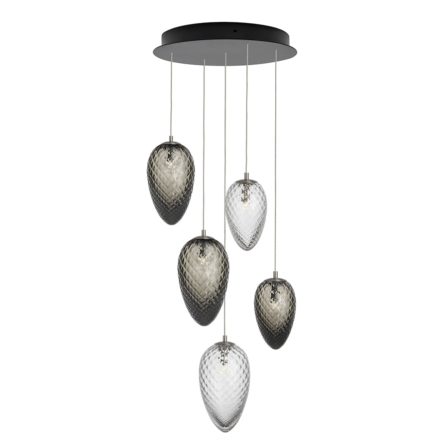 Inneholder 5 munnblåste kongler i flott harmoni, i størrelsene 17cm, 21cm og 23cm i røkgrå og 17cm og 23cm klart glass.