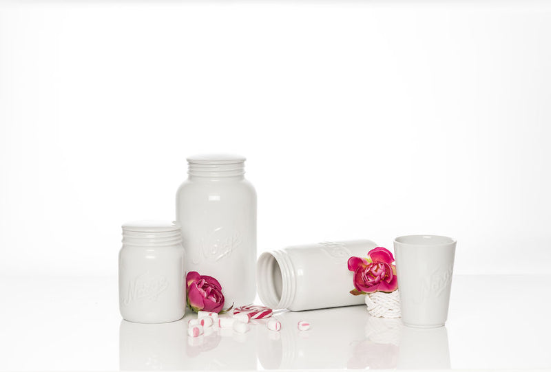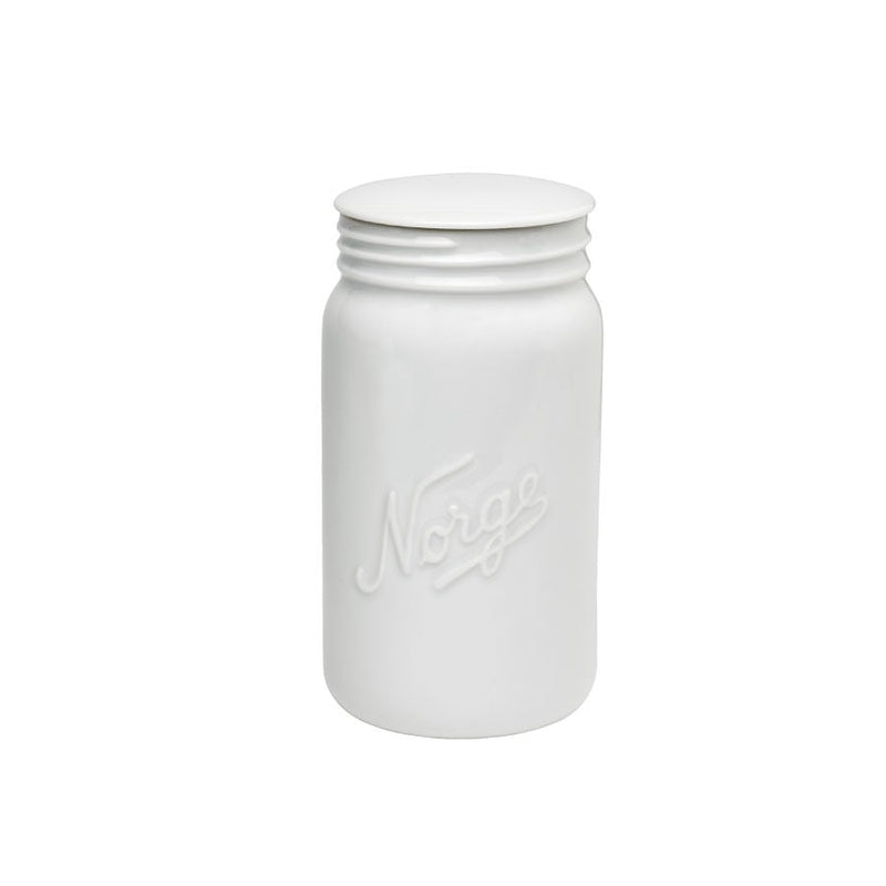 Vakker oppbevaring i ren porselen. Denne vakre retrokrukken med norgesglasslogo og porselenslokk vil garantert forskjønne kjøkkenbenken, pynte opp i vinduskarmen og gi en god følelse når du åpner kjøkkenskapene. Fylt med noe godt, er de en perfekt gave! Produseres hos Porsgrunds Porselænsfabrik.