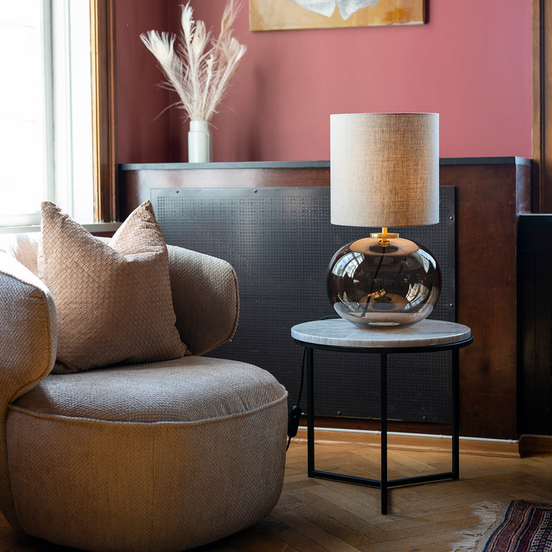 Bordlampen Senja har en avrundet base i munnblåst glass og tekstilskjerm i høy kvalitet. Senja er tilgjengelig i ulike glass- og skjermfarger, slik at du kan sette sammen den perfekte lampen til ditt hjem.