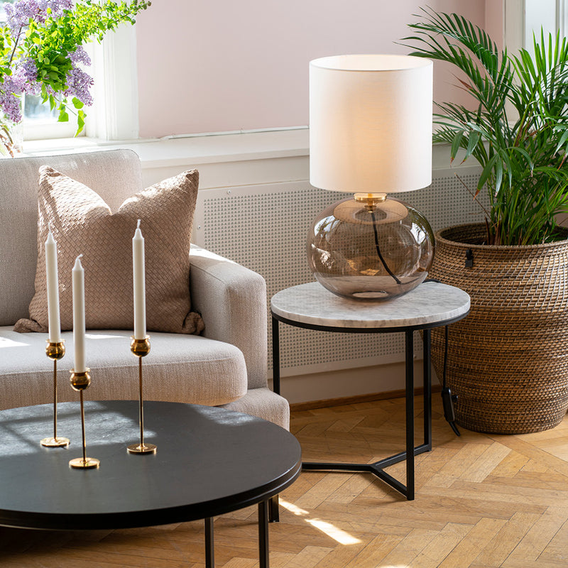 Bordlampen Senja har en avrundet base i munnblåst glass og tekstilskjerm i høy kvalitet. Senja er tilgjengelig i ulike glass- og skjermfarger, slik at du kan sette sammen den perfekte lampen til ditt hjem.