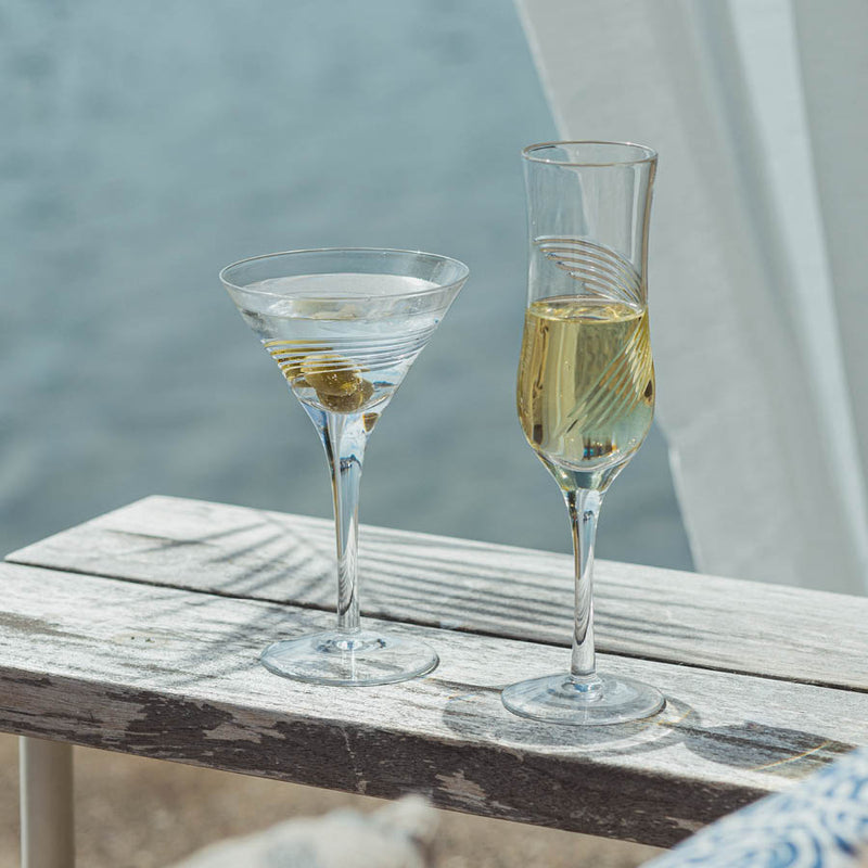 Håndverk og Design: Designet av Edla Freij og nøye håndlaget ved Hadeland Glassverk, dette cocktailglasset kombinerer tradisjonelle teknikker med et friskt og moderne design. Munnblåst og håndslipet, står mønsteret ut som en hyllest til havets dynamikk og skjønnhet.