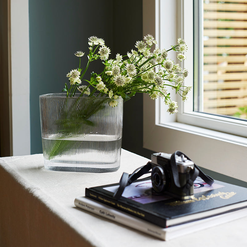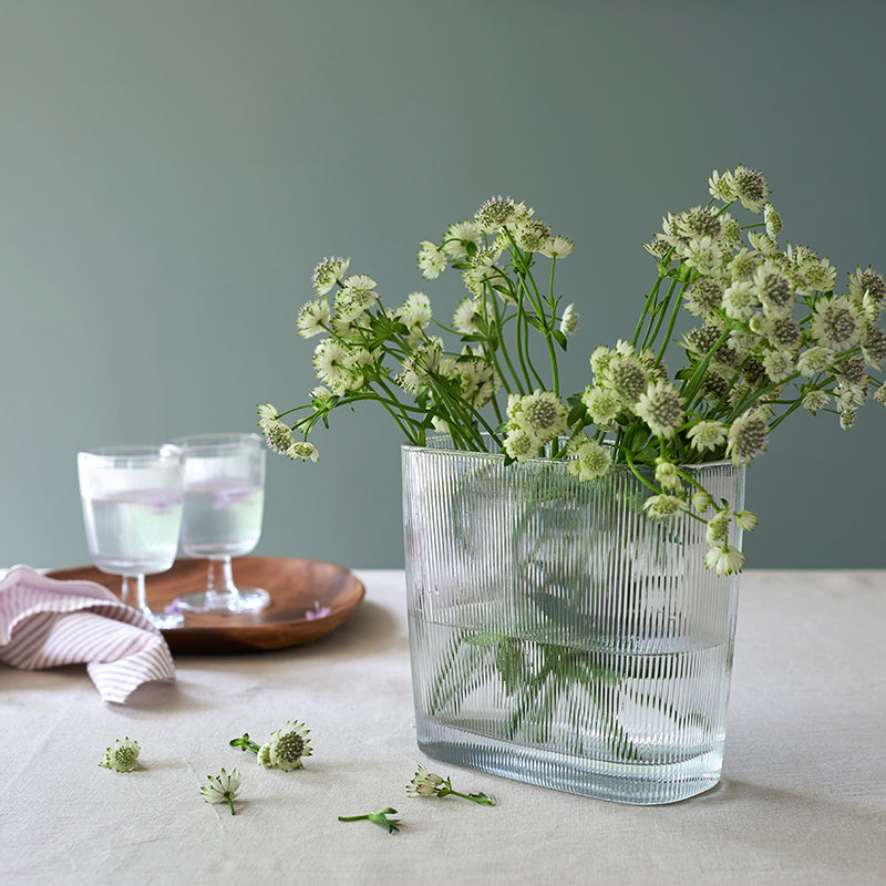 Stilren, avlang vase med lekkert rillemønster i glasset. Vasen passer perfekt til en luftig, organisk bukett, eller til én enkelt blomst for et enkelt uttrykk. Minimalistisk og vakker i sin enkelthet.