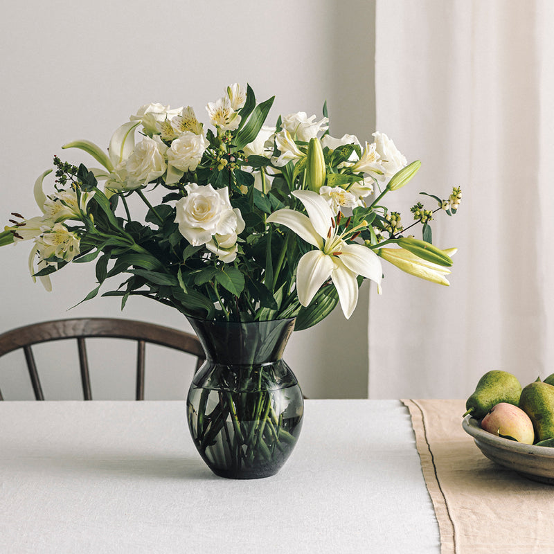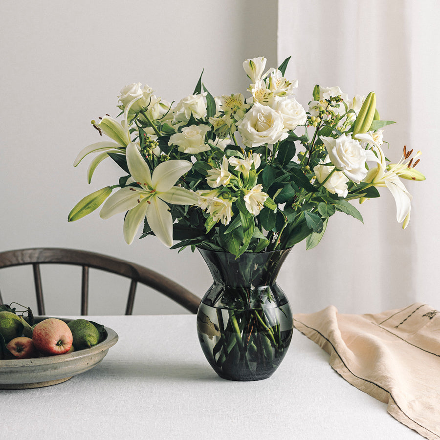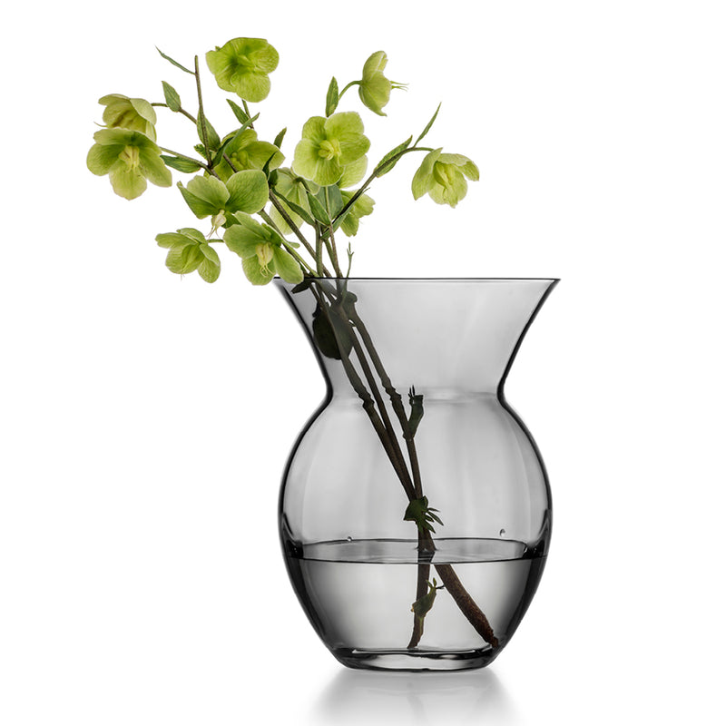 Serien har et tidløst design laget i munnblåst glass i både klar, og grå farge. Den elegante formen passer perfekt for snittblomster i alle sesonger. Vasene har optikk i glasset som gir et nydelig lysspill. Glasset er munnblåst som gjør hvert produkt unikt.