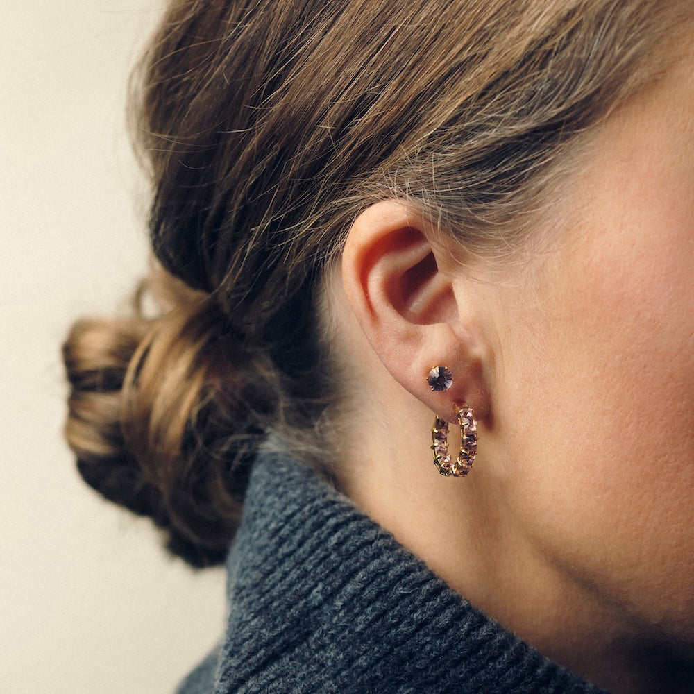 Vera øredobber er en klassisk og elegant hoop omkranset av håndslipte glassteiner som skinner hele veien rundt. Det tidløse designet gir et feminint og sofistikert uttrykk, samtidig som steinenes klare refleksjoner tilfører smykket et moderne lys. Perfekt til hverdags – like vakker til fest.
